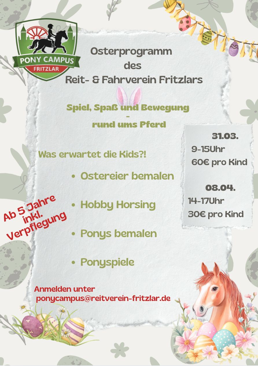 Das erste Event des Pony Campus steht an!🥳🍀 Wir haben für eure Kids zwei Programmtage während der Osterferien geplant ✍🏼 Stattfinden sollen sie am 31.03 von 9-15Uhr und am 08.04 von 15-17Uhr🗓️ immer inklusive Verpflegung🍽️🧃🥤